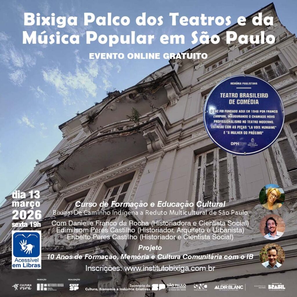Nesse curso em formato online, vamos debater como o Bixiga tornou-se um pólo de convergência da cultura na cidade de São Paulo, palco dos grandes teatros e de companhias teatrais, de espaços culturais, de coletivos e grupos de arte, cultura e música, da “noite alternativa”, além de ser reconhecido como um território multicultural onde nasceram e cresceram importantes expressões artísticas da música popular brasileira.
